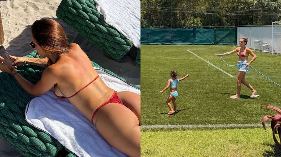 Em uma das imagens, Biancardi surge com biquíni vermelho, deitada em uma esteira para renovar o bronzeado. Já em outro, aparece dando banho de mangueira na primogênita, Mavie, de 2 anos.